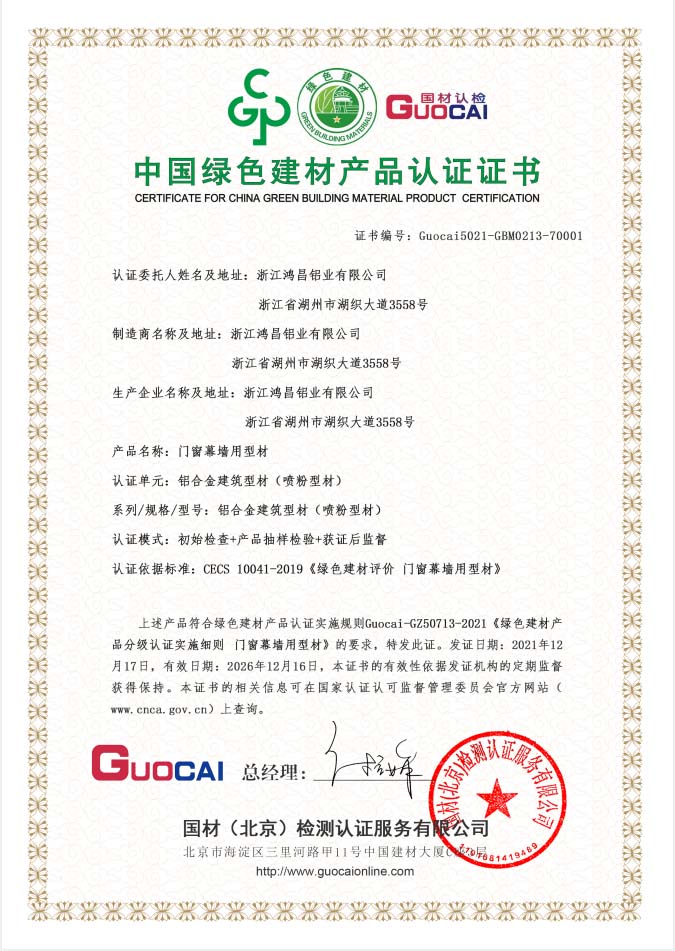中國綠色建材產品認證證書-鋁合金建筑型材(噴粉型材)